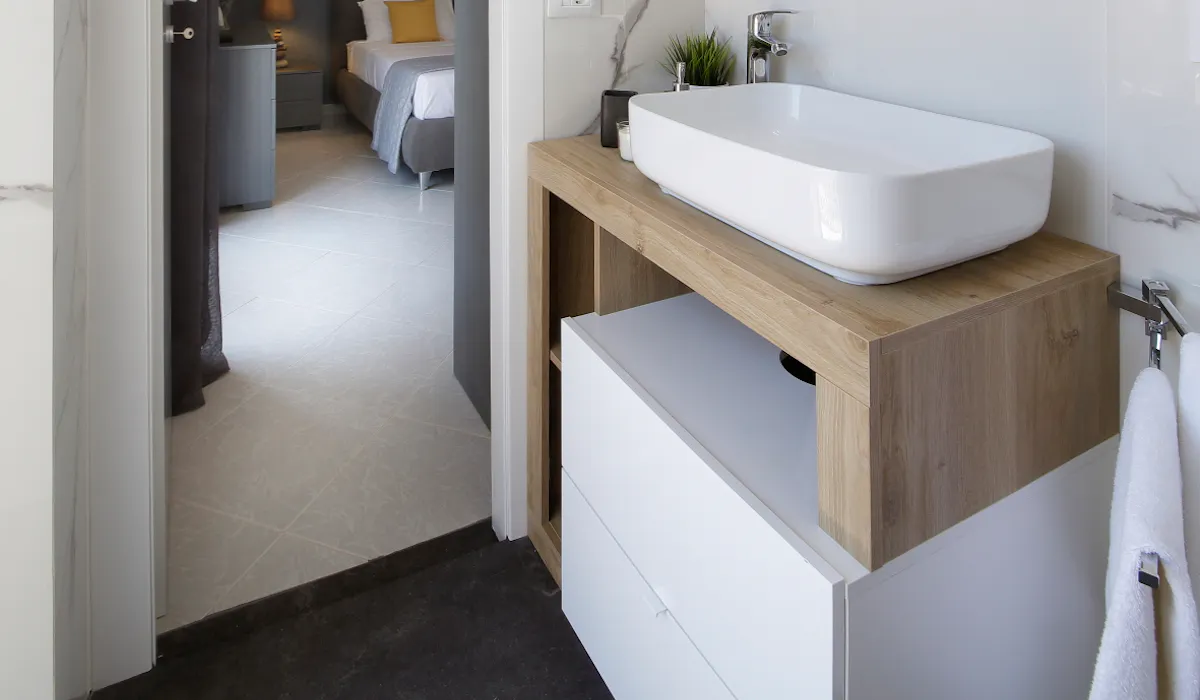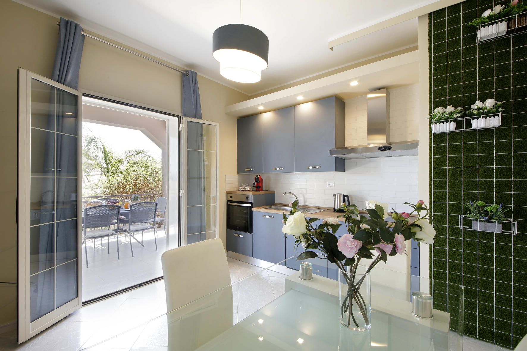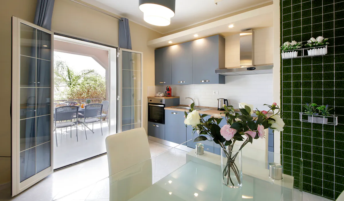 From the kitchenand the living room, guests can access a large covered veranda with a sea view, furnished with table,chairs, sunloungers, a swing and recliners. This is the perfect spot for outdoor dining or simply unwinding while enjoying the fragrance of jasmine and breathtaking sunsets.